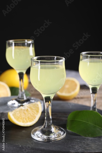 Tasty limoncello liqueur, lemon and green leaf on table, closeup