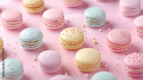 Tasty pink, blue, yellow, and green French macarons with delicate textures and gloss finishes, showcasing Easter sweet desserts in a studio setting on pastel pink background