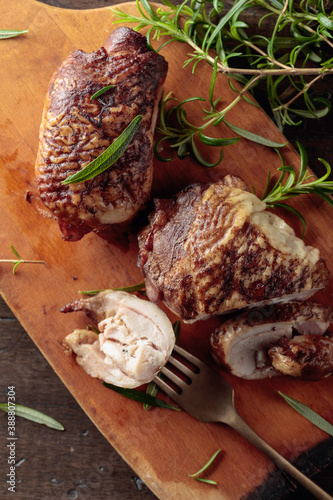 Tasty smoked chicken thighs with rosemary on a cutting board.
