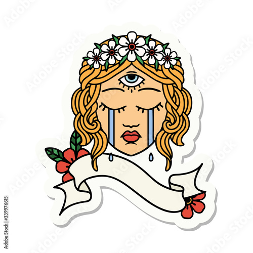 tattoo sticker with banner of female face with third eye crying