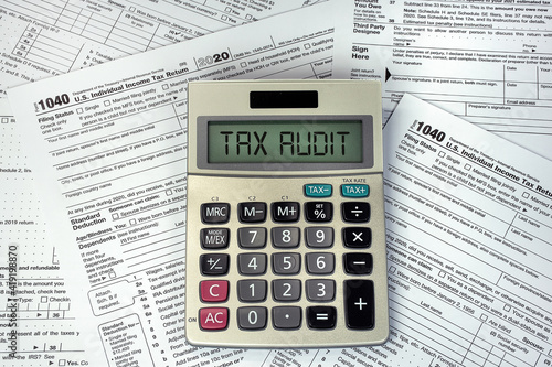 Tax audit text on business calculator screen with 1040 Internal Revenue Tax Forms