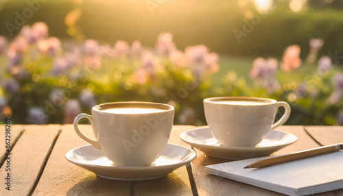 Tazas de Cafe iluminadsa por el sol de la tarde, acompañada en medio de un jardín floreciente