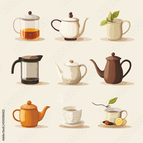 Tea Collection: Various Teapots, Tea Cups, and Leaf-Infused Drinks