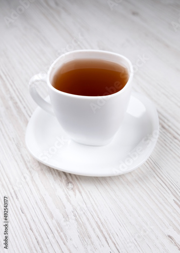 Tea in a white cup on a wooden table