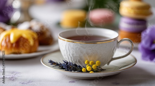 tea party aesthetics, a fancy tea spread with dainty sandwiches, pastries, and a herbal tea pot emphasizing the steam and pastry glaze