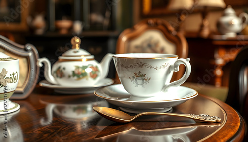 Tea table with porcelain cup, saucer, and vintage teaspoon, surrounded by the ambiance of an antique tea room. Old Money Aesthetic. Banner, sticker style, with white tones