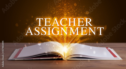 TEACHER ASSIGNMENT inscription coming out from an open book, educational concept