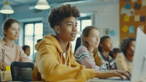 Teacher Giving Lesson to Diverse Multiethnic Group of Female and Male Students in College Room Learning New Academic Skills on a Computer Lecturer Shares Knowledge with Smart Young Sch : Generative AI