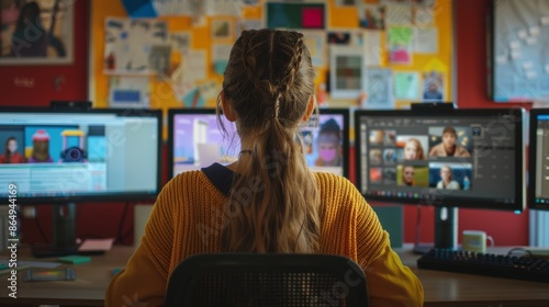 Teacher sits at her desk, developing curriculum and planning educational projects on multi computer screens. view from behind