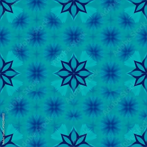 Teal Floral Kaleidoscope: Seamless Pattern of stylized flowers in shades of teal and blue, creating a mesmerizing kaleidoscopic effect. Perfect for backgrounds, textiles, and design projects.
