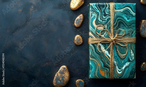 Teal gift with gold ribbon, gold pebbles on dark background, top view.