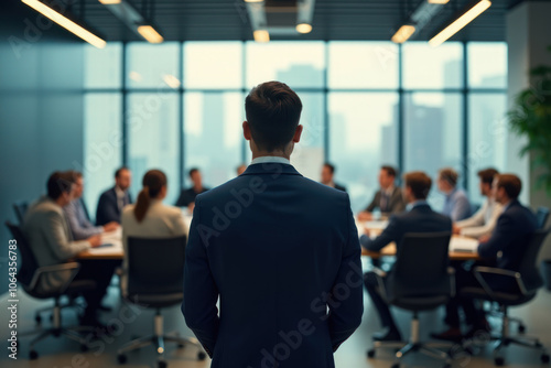 Team Dynamics in a Modern Office: Businessman in Suit Facing Colleagues in an Office Setting, Seen from Behind