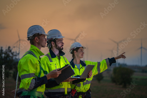 Team Engineers men and woman checking and inspecting on construction with sunset sky. people operation. Wind turbine for electrical of clean energy and environment. Industrial of sustainable.