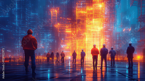 Team of engineers and architects discussing building designs, vector illustration capturing the essence of a modern construction site.