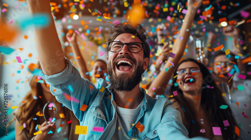 Team of office workers celebrating a huge milestone. Confetti flying in the air around them.