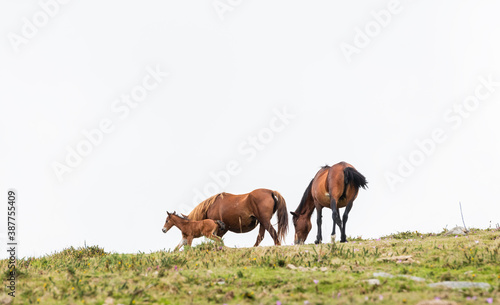 Team of wild horses and young colt eating grass in Galicia on a foggy day.