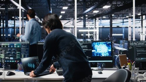 Technician arriving in data center office, coding with generative AI assistance. IT expert sitting at desk, starting work on artificial intelligence large language model solving tasks, camera A