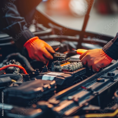 Technician Hands of car mechanic working repair in auto repair Service electric battery and Maintenance of car battery. Check the electrical system inside the car.
