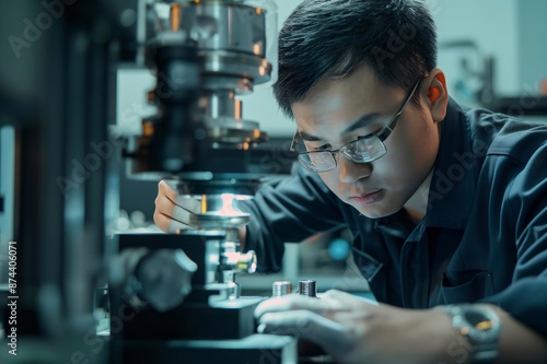 Technician wearing safety glasses is using a measuring machine in a factory, carefully inspecting a small metal part