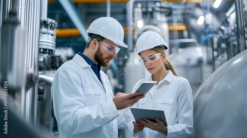 Technicians Inspecting Cutting-Edge Biofuel Processing Technology in Modern Industrial Facility