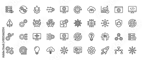 Technology and development line icon set. Vector pictograms of settings, optimization, server, and cloud computing, editable stroke illustration.