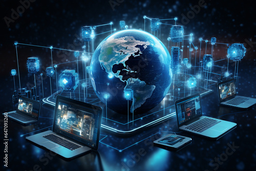 technology devices and icons connected to digital planet earth