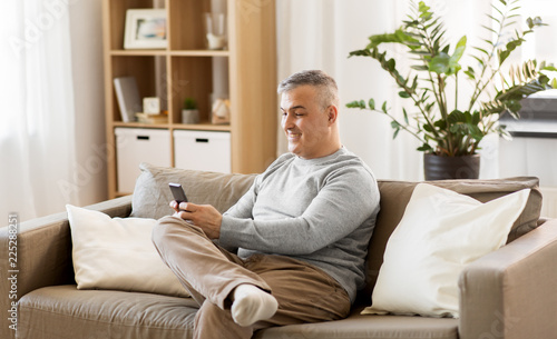technology, people, lifestyle and communication concept - man with smartphone sitting on sofa at home