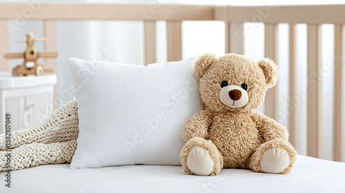 Teddy Bear and Pillow in a Nursery Crib Setting for Baby Sleep and Comfort with Wooden Toy Plane