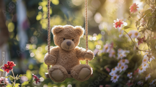 Teddy bear on a swing in a sunny garden