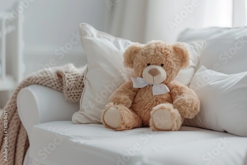Teddy bear on white sofa with pillow and knitted blanket