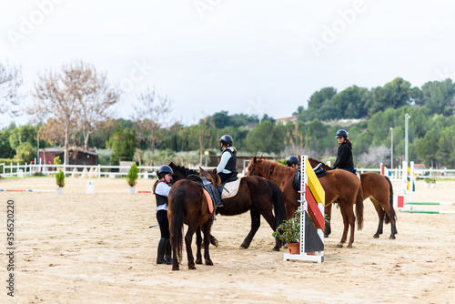 Teen jockeys in helmets communicating with each other while riding obedient horses on sandy dressage arena during lesson in equestrian school