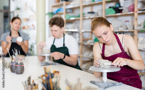 Teenage girl attentively learns how to make pottery with a wooden sticker in the workshop