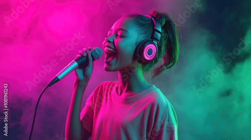 Teenager girl happily sings to microphone and dances under neon pink green lights