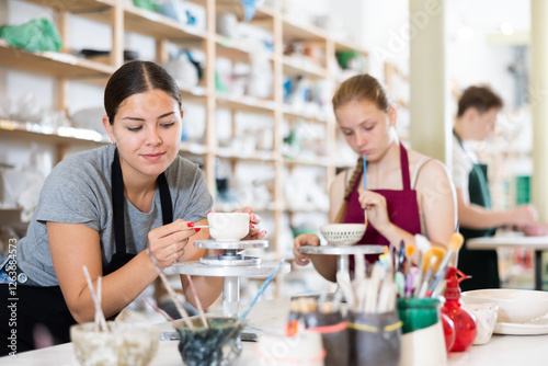 Teenagers are interested in making dishes from clay in a pottery workshop