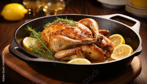 Tempting and mouthwatering roast chicken sizzling in a pan, creating a tantalizing aroma