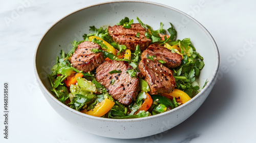 Tender beef stir fry with colorful bell peppers and fresh greens