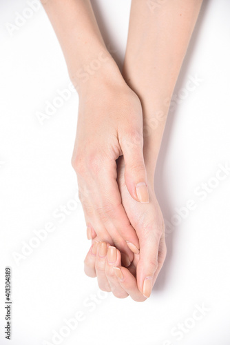 Tenderness woman hand on white background