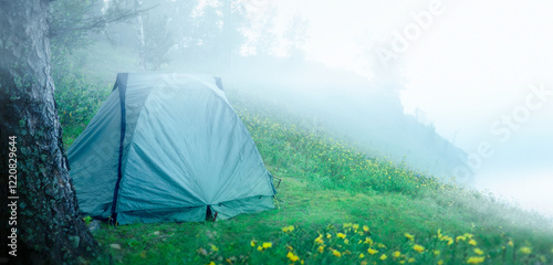 Tent in the fog in the morning behind a green meadow on top of a mountain in a secluded place.