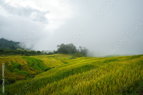 Terraced rice field landscape in harvesting season with low clouds in Y Ty, Bat Xat district, Lao Cai, north Vietnam