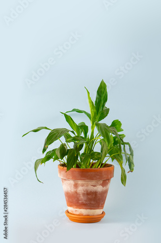 terracotta pot with plant on light blue background