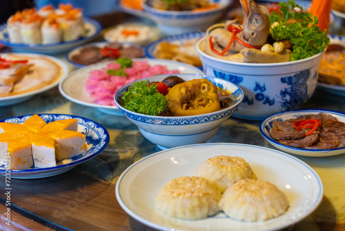 Tet tray. Full of traditional dishes. Chinese new year festival table with asian food. Vietnamese food for Tet holiday in lunar new year. Text on food meaning happy and peaceful.