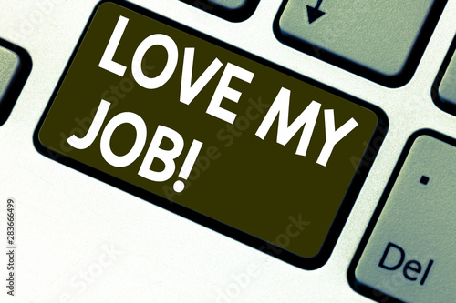 Text sign showing Love My Job. Conceptual photo To be pleased with the work that one does being comfortable Keyboard key Intention to create computer message pressing keypad idea
