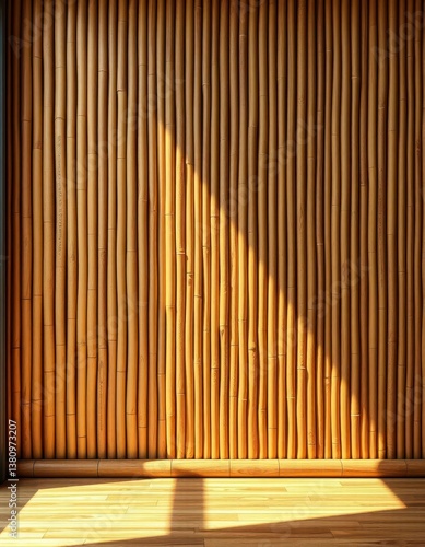 Textured bamboo wall, vertical slats, natural light, warm tones, vertical, photo, interior