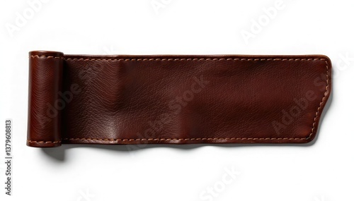 Textured, dark brown leather flap, cleanly isolated against stark white backdrop , flap, background, belt