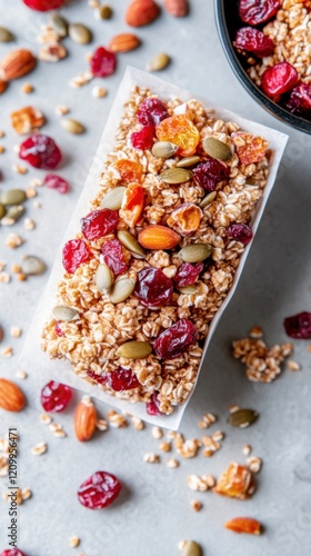 Texture-rich bulgur bars with cranberries and pumpkin seeds highlighted