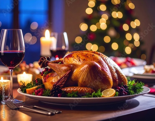 Thanksgiving dinner featuring a beautifully roasted turkey with festive decorations and candlelight ambiance
