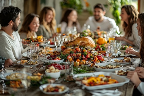 Thanksgiving dinner on a farmhouse table, rustic decor, traditional turkey, vintage dishware, large extended family, autumn harvest theme Farmhouse Thanksgiving, Family reunion