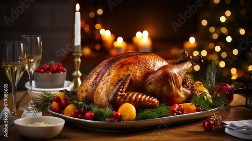 Thanksgiving dinner, Thanksgiving turkey. Served table. Thanksgiving table served with turkey, decorated with bright autumn leaves. Roasted turkey,