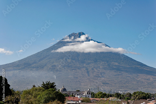 The Agua Volcano, a prominent stratovolcano visible throughout the city of Antigua in southern Guatemala.