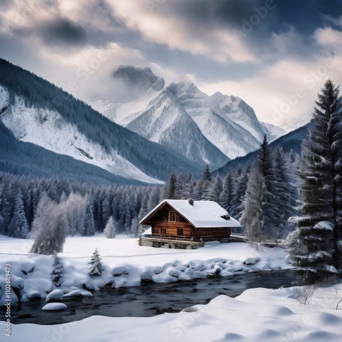 the AI Image Generator, Cozy Cabin in a Serene Snowy Mountain Landscape